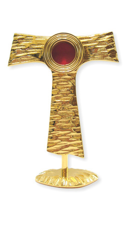 Gilded brass reliquary in the shape of the Franciscan symbol "tau" with a height of 20 cm