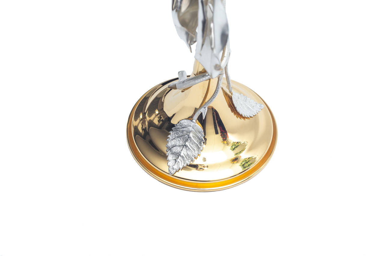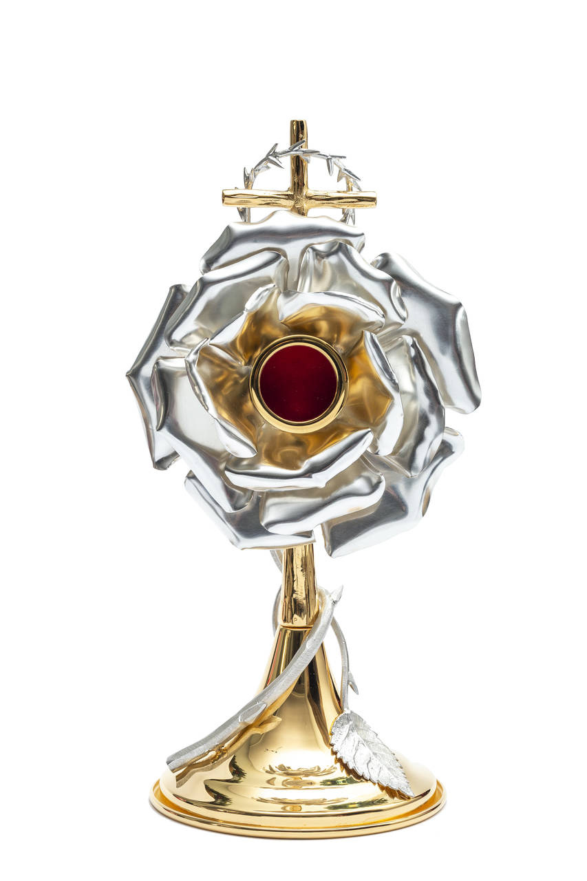 Very impressive gilt brass reliquary with rose motif, for one relic. Available in three colors: gold, silver or patinated silver.It is possible to make an engraving on the base.The reliquary was made with great care. It contains numerous ornaments and embossing, and has been polished which gives it an extra shine.