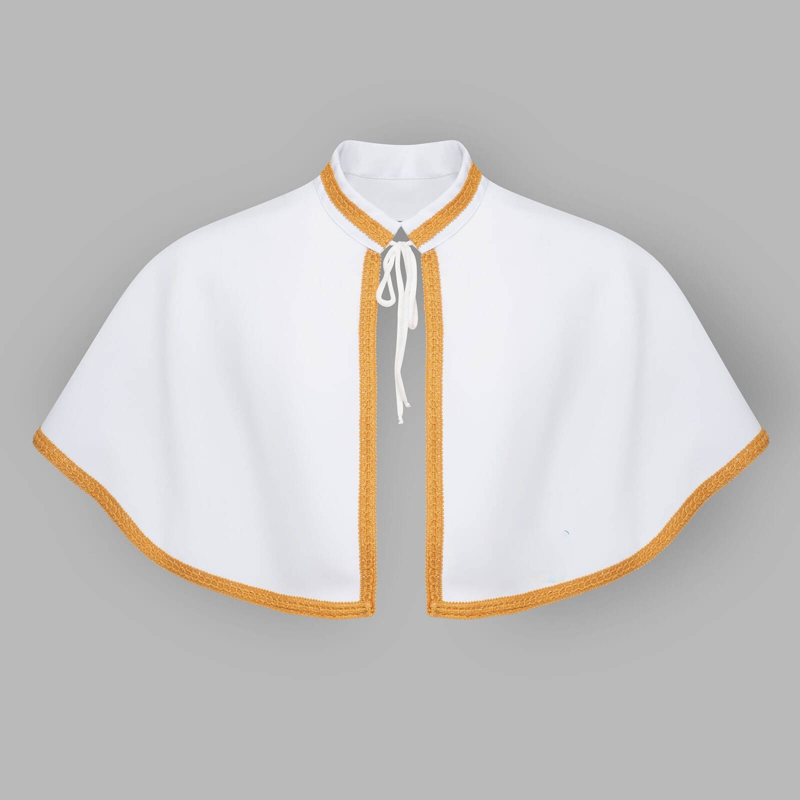 Pelerynka wykończona jest złotą ozdobną taśmą.