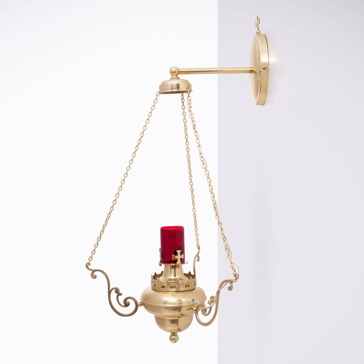 - Electric hanging lamp, made of brass. Protected with clear varnish. Lampshade in red.