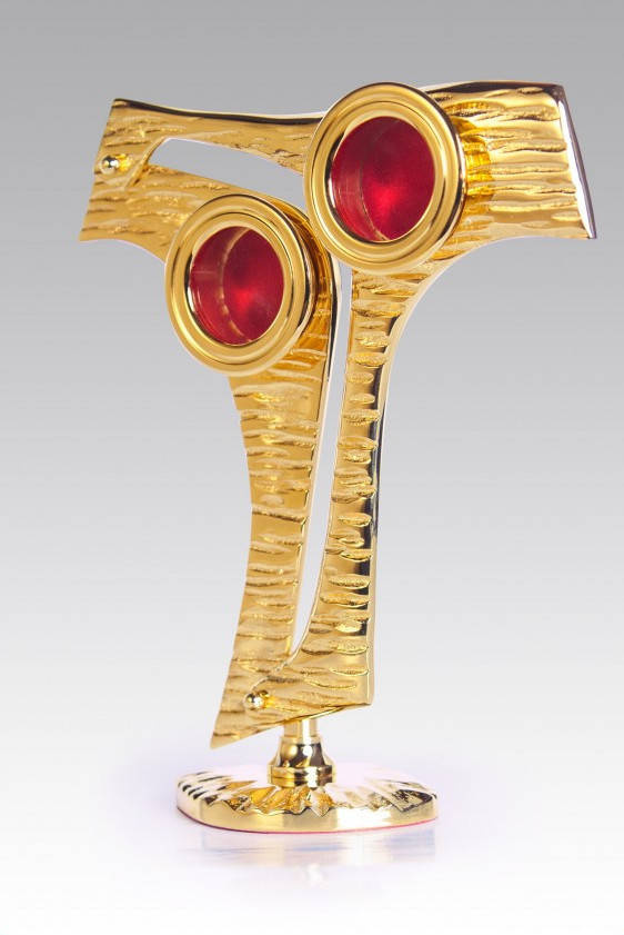 Gilded brass reliquary in the form of a TAU symbol for two relics. Dedicated to St. To St. Michael and St. To Zbigniew. The reliquary was made with great care, it is a handicraft. It contains numerous ornaments and embossing, and has been polished which gives it an extra shine.