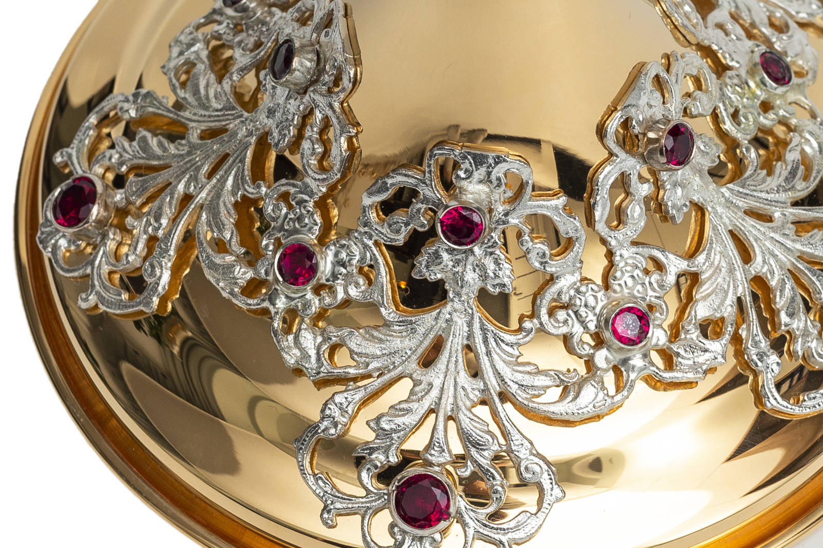 Liturgical tin with silver nodus richly decorated with rubies.. The can is made of the highest quality precious materials, which guarantee high durability and corrosion resistance. Gold-plated interior. liturgical can, meets required standards for storing consecrated communicants.