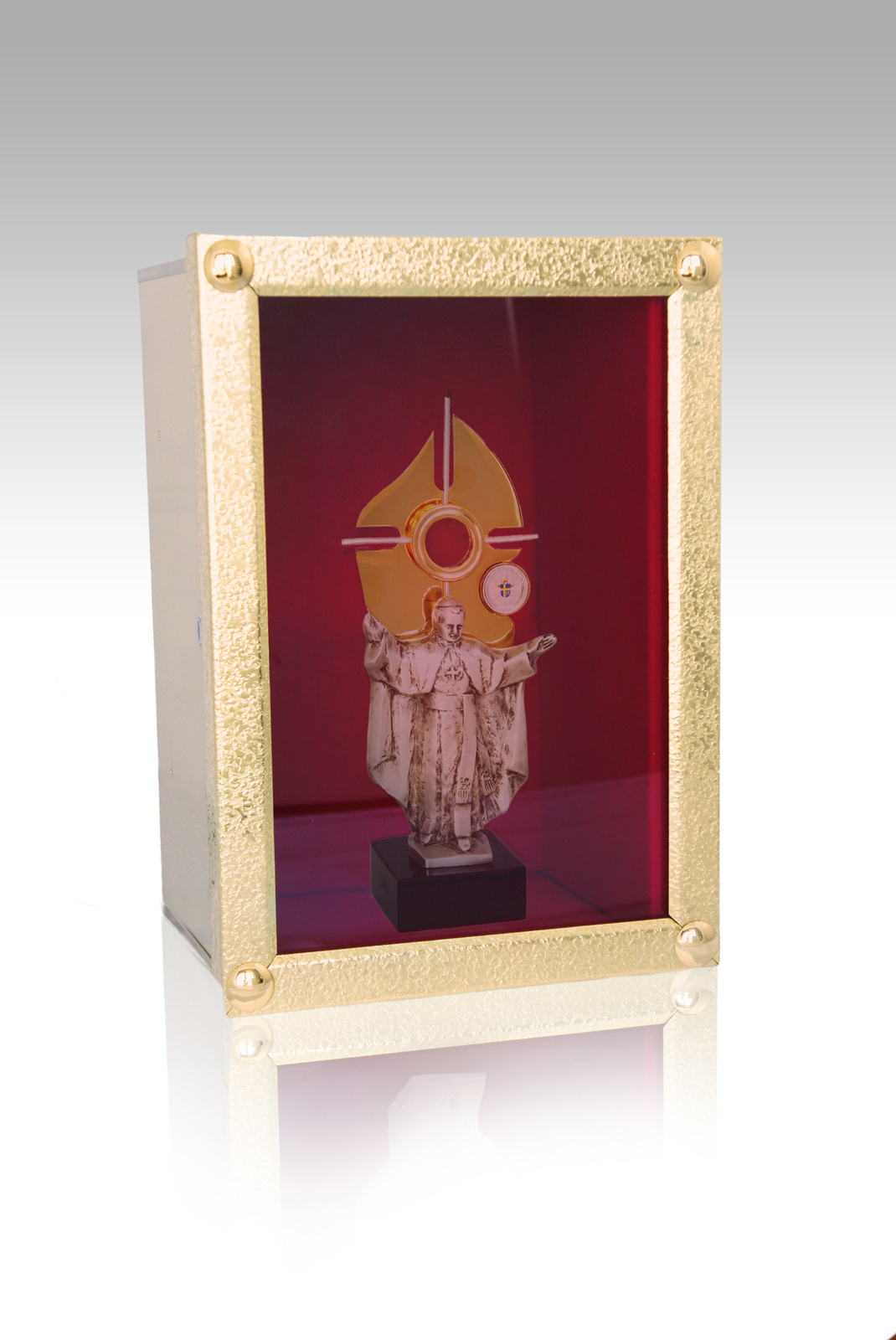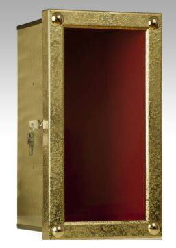 The reliquary is made of steel, clad on the outside with polished, lacquered brass, and inside with velour decorative material. Glazed with so-called safe (bonded) glass, the door is secured with a concealed lock on the left side. The reliquary is illuminated with warm LEDs installed in the upper part. 12V (plug-in) power supply is included in the kit. As standard, it is attached to the wall through pre-prepared holes in the back, which are invisible after installation.