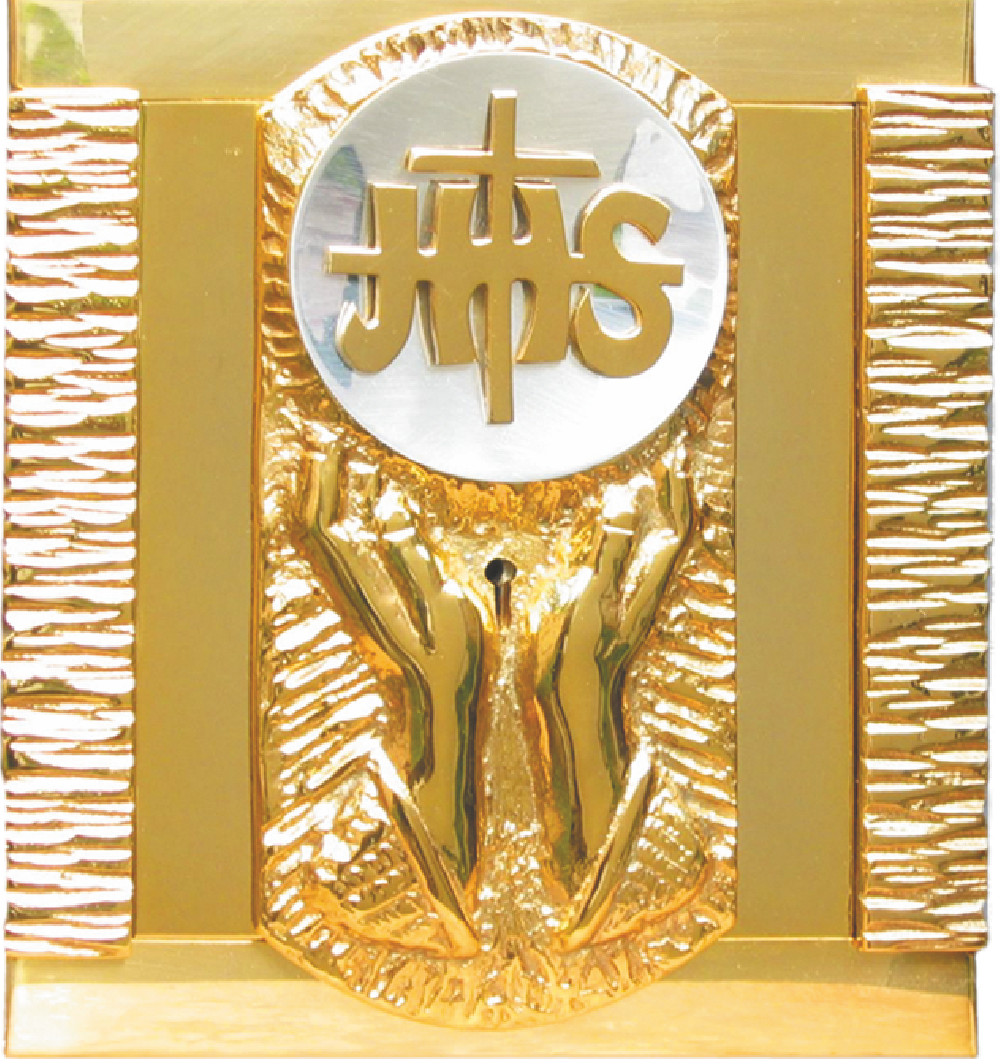 Tabernacle made according to current standards. Fireproof, armored with horizontal and vertical bolts. The exterior applications were gilded, made of brass using the metalwork method. The interior of the tabernacle is made of chrome-nickel plate or gilded brass. Steel structure consisting of double-welded walls. The outer, side housing, is made of polished brass plate.