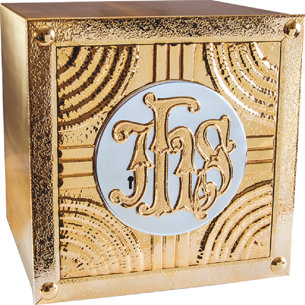 Tabernacle made according to current standards. Fireproof, armored with horizontal and vertical bolts. The exterior applications were gilded, made of brass using the metalwork method. The interior of the tabernacle is made of chrome-nickel plate or gilded brass. Steel structure consisting of double-welded walls. The outer, side housing, is made of polished brass plate.