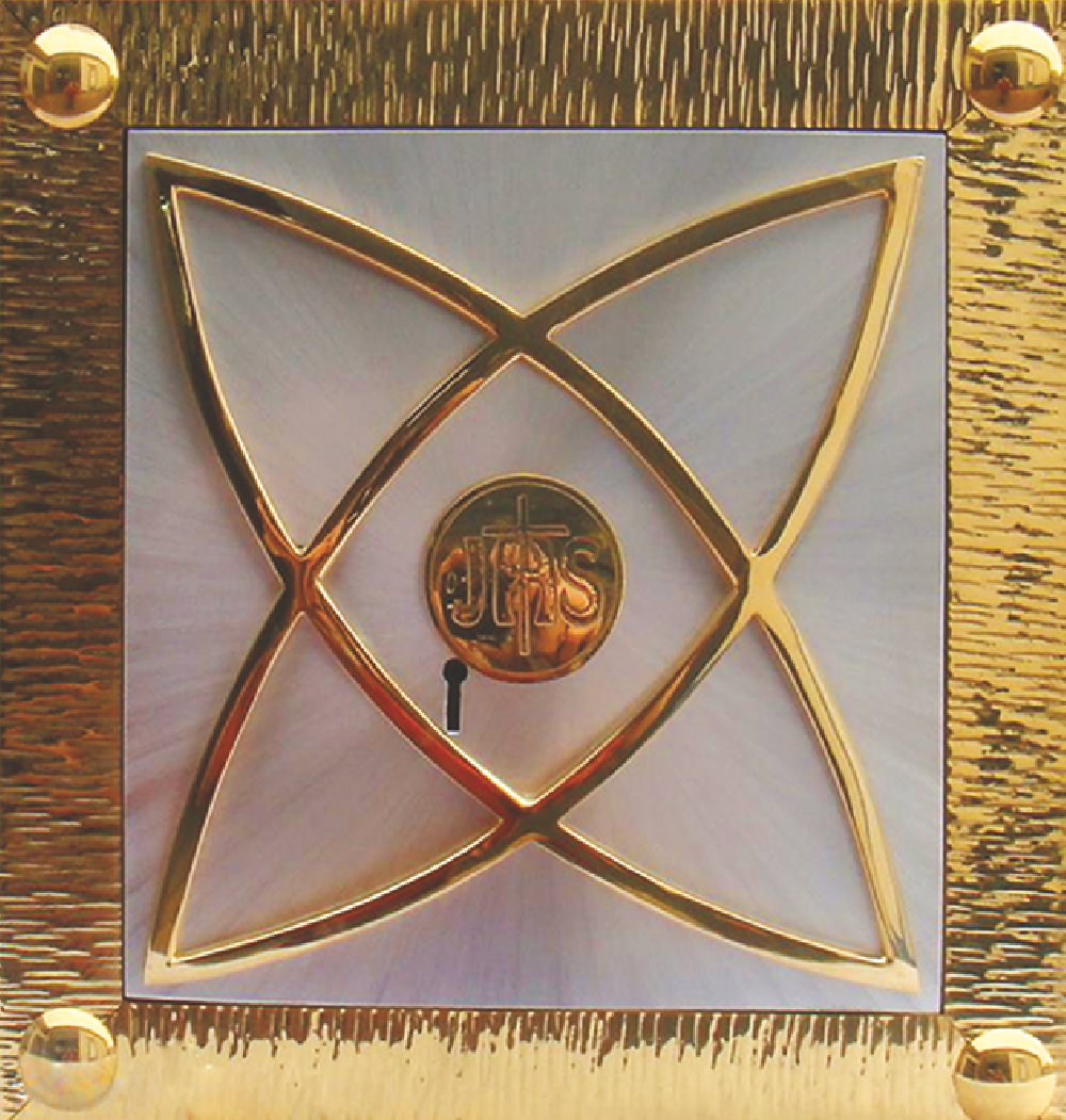 Tabernacle made according to current standards. Fireproof, armored with horizontal and vertical bolts. The exterior applications were gilded, made of brass using the metalwork method. The interior of the tabernacle is made of chrome-nickel plate or gilded brass. Steel structure consisting of double-welded walls. The outer, side housing, is made of polished brass plate.