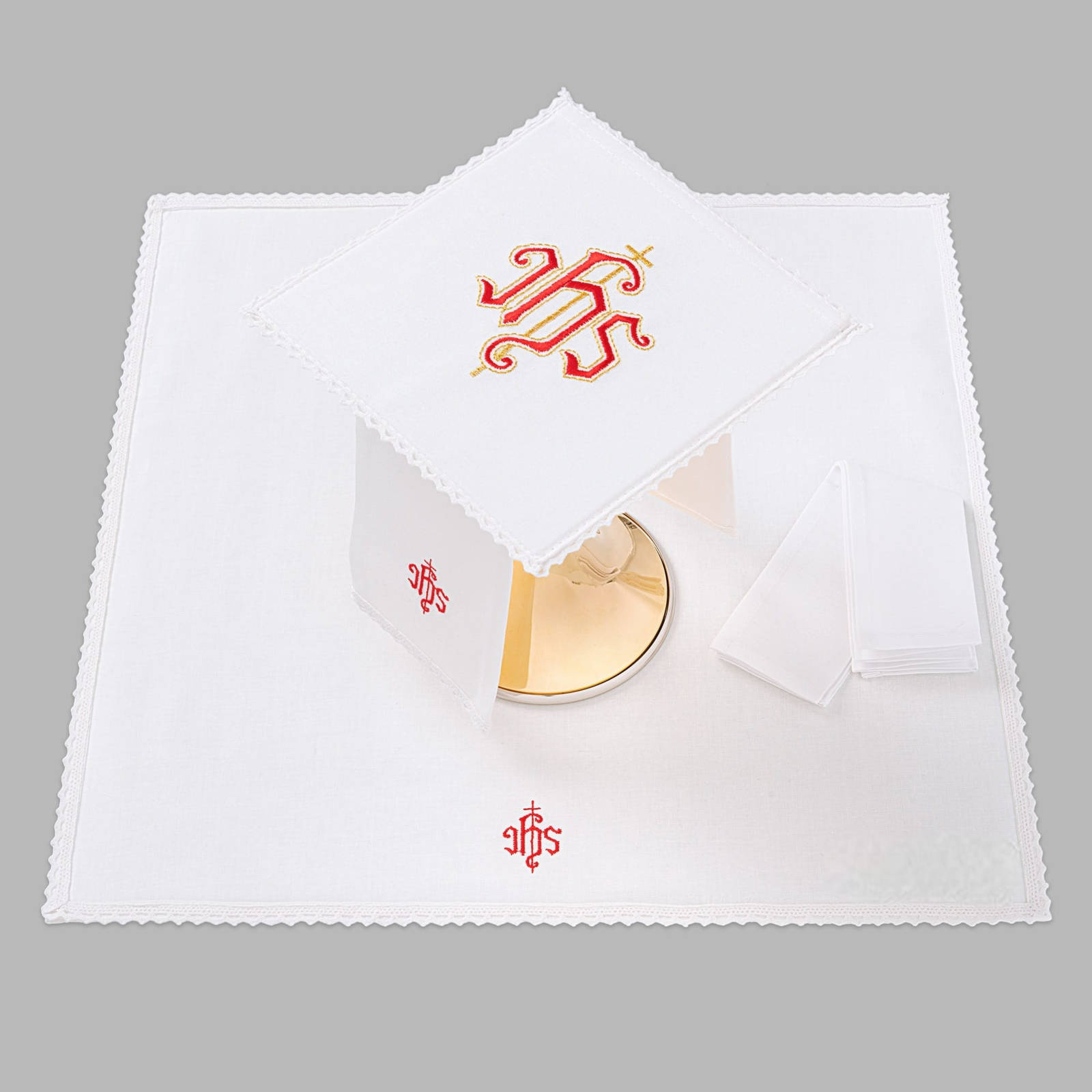 Bielizna kielichowa ołtarzowa wykończona koronką JHS czerwony
