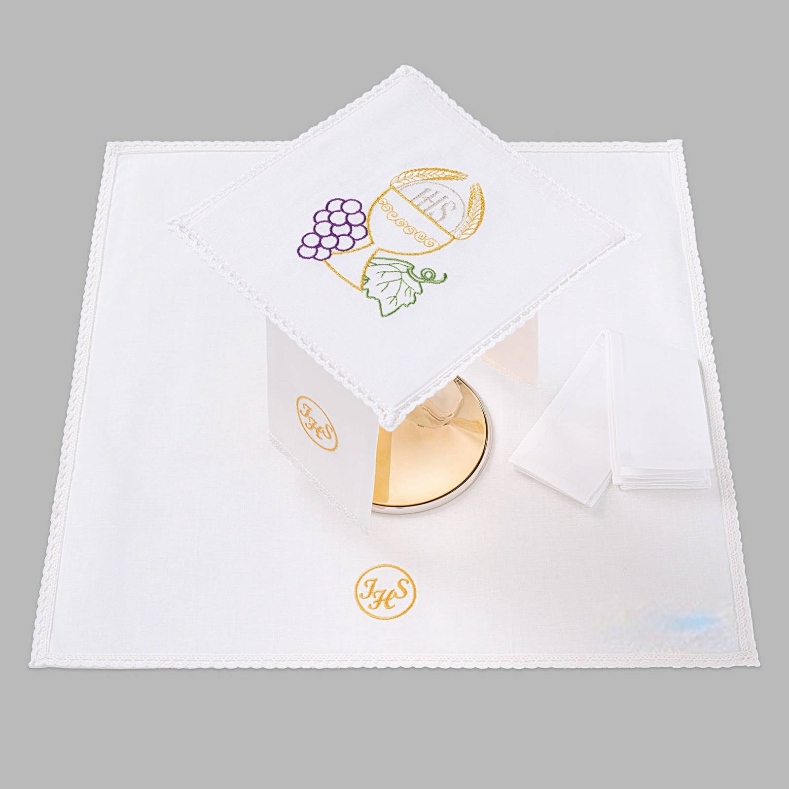 Bielizna kielichowa ołtarzowa wykończona koronką JHS winogrona