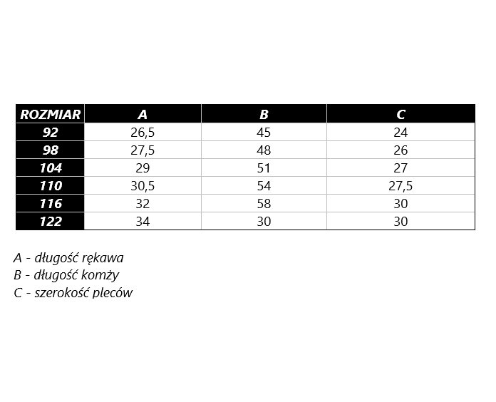 Veľkosť kombinézy podľa aktuálnej výšky dieťaťa.