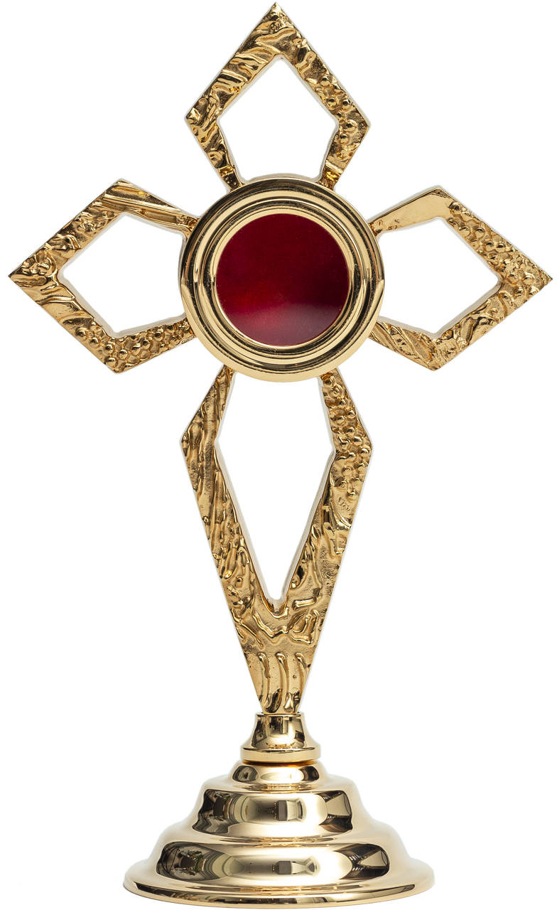 Pozlátený mosadzný relikviár v tvare kríža na jednu relikviu. K dispozícii v troch farbách: zlatej, striebornej alebo patinovanej striebornej. Relikviár bol vyrobený s veľkou starostlivosťou. Obsahuje množstvo ozdôb a reliéfov a bol vyleštený, aby získal mimoriadny lesk.