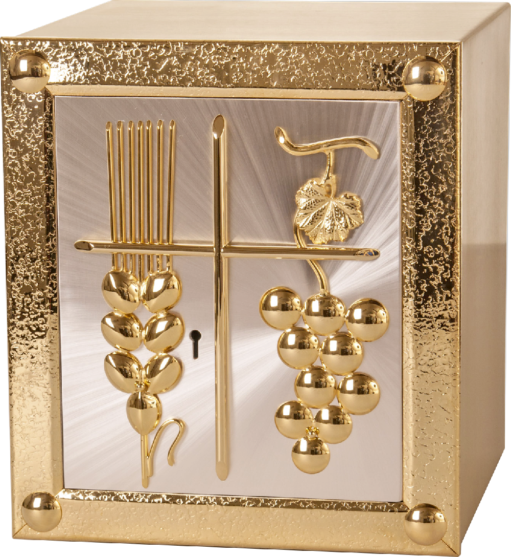 Tabernákulum vyrobené podľa súčasných noriem. Ohňovzdorné, pancierované horizontálnymi a vertikálnymi skrutkami. Vonkajšie aplikácie boli pozlátené, vyrobené z mosadze metódou kovotepectva. Vnútro svätostánku je z chrómniklového plechu alebo pozlátenej mosadze. Oceľová konštrukcia pozostávajúca z dvojito zváraných stien. Vonkajší, bočný kryt je vyrobený z lešteného mosadzného plechu.