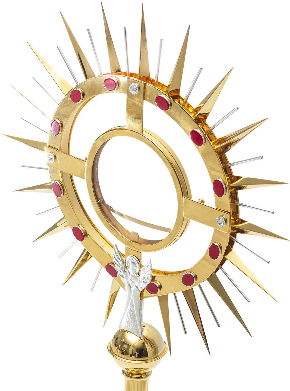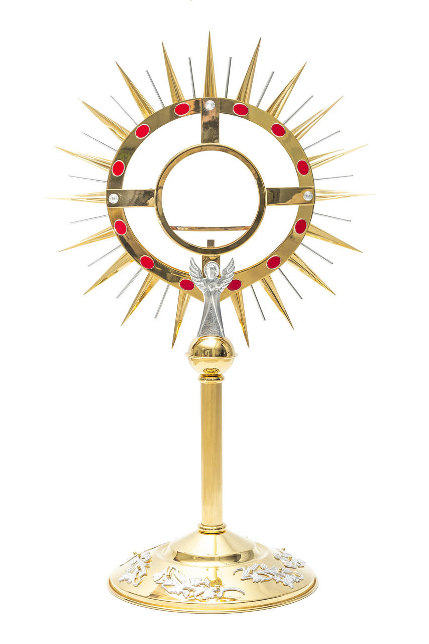 - Veľká monštrancia zdobená kameňmi, mosadznými, pozlátenými a postriebrenými prvkami, vysoká 80 cm