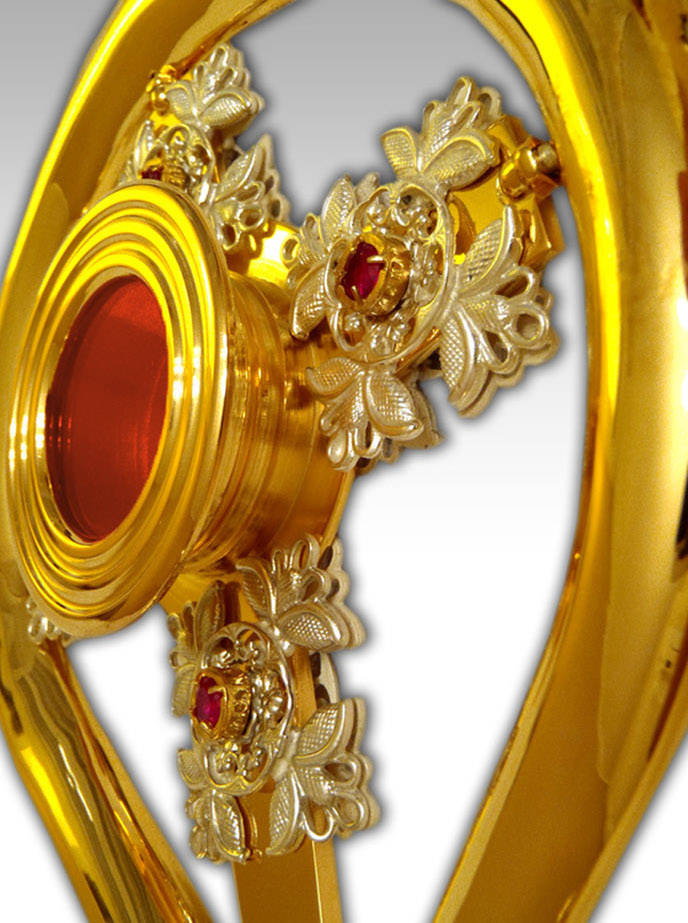 - Veľký mosadzný pozlátený relikviár v tvare pastiera zdobený striebrom a rubínmi, vysoký 37 cm